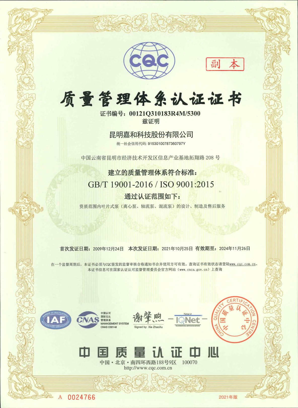 質量管理體系認證證書