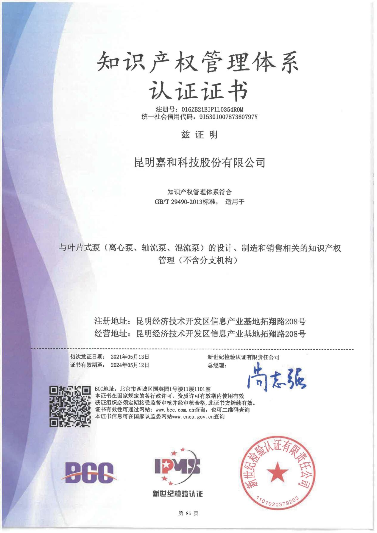 知識產權管理體系認證證書